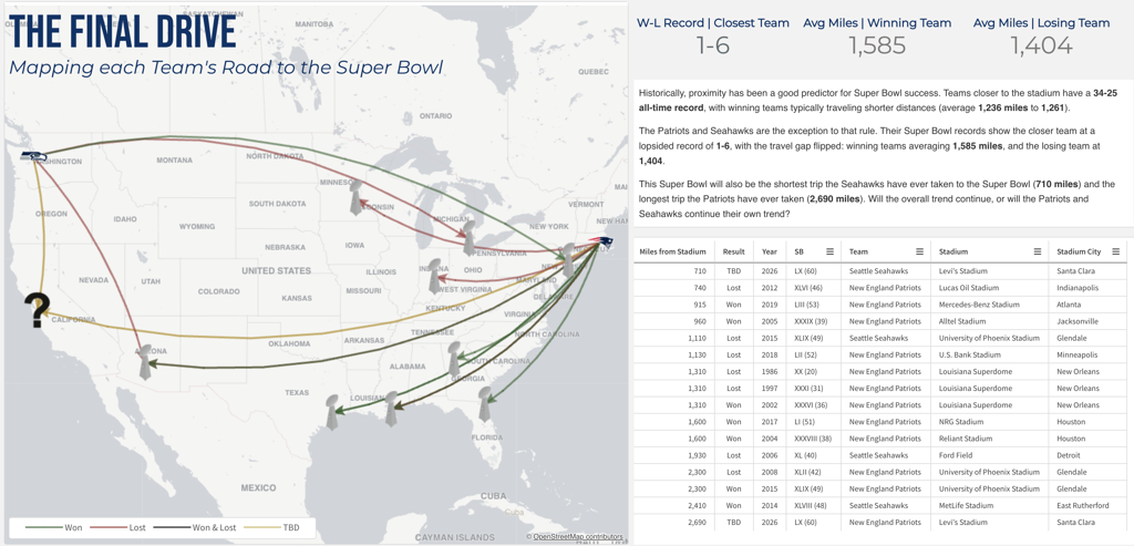“I built a multi-layered Qlik Sense map using data from Pro Football Reference, supplemented by Gemini for historical and geographic details,” Jenkins said. “Using the Data Load Editor, I concatenated location data to accurately plot travel paths, displaying team logos and the Lombardi Trophy via URL-based images. To finish, I used a Layout Container to overlay custom branding and an HTML legend on a pale map base, keeping the focus entirely on the data story.”