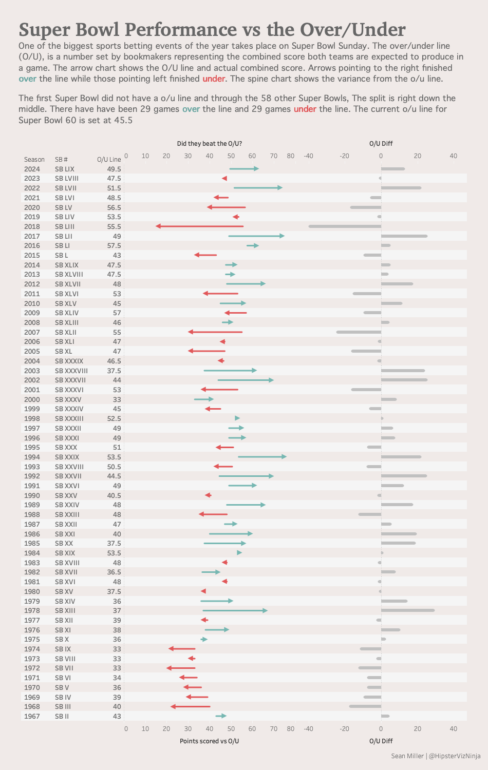 “I created this long-form dashboard using data from SportsBettingDime to investigate how accurate the over/under line has been over time. The arrow chart is built using Tableau gantt chart type and custom shape mark types. I added a secondary axis to show the variance between the line and final total score with a common baseline for easy scanning,” Miller said. “I really enjoy seeing this data presented this way because we can immediately see the ouliers, namely the 2018 Super Bowl against the Patriots and the Rams. These two teams came into the game with two of the most explosive offenses in the league that season. Everyone assumed this would be a very high-scoring game, but it was, in fact, the opposite.”