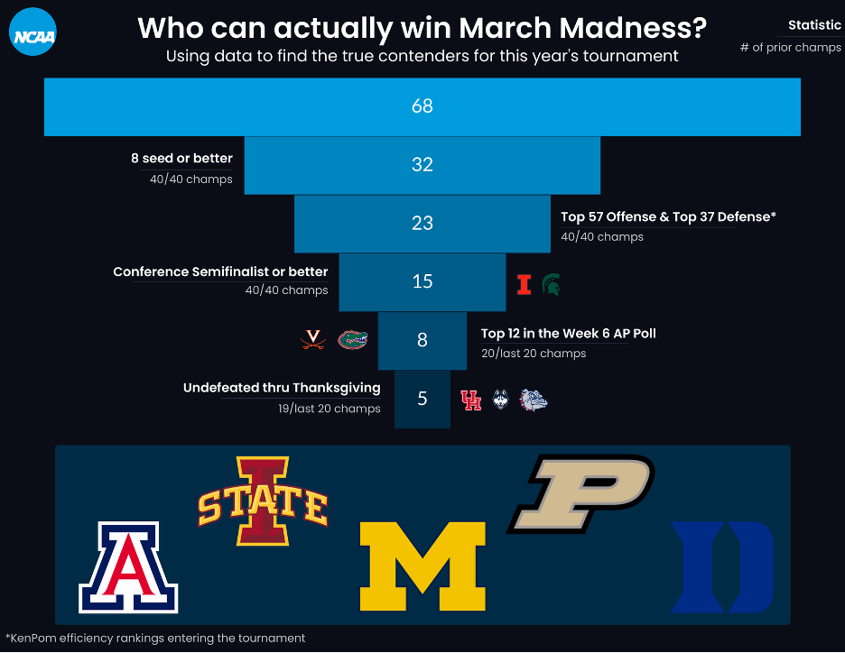“To identify the True Contenders for the 2026 NCAA Men's Tournament, I created a funnel to isolate the champion from the field,” Jamal explains. “I chose to combine data-backed team statistics, such as KenPom efficiency ratings and conference tournament performance, with more nuanced light-hearted filters. Layering these criteria, I narrowed the field to a shortlist of five teams.”