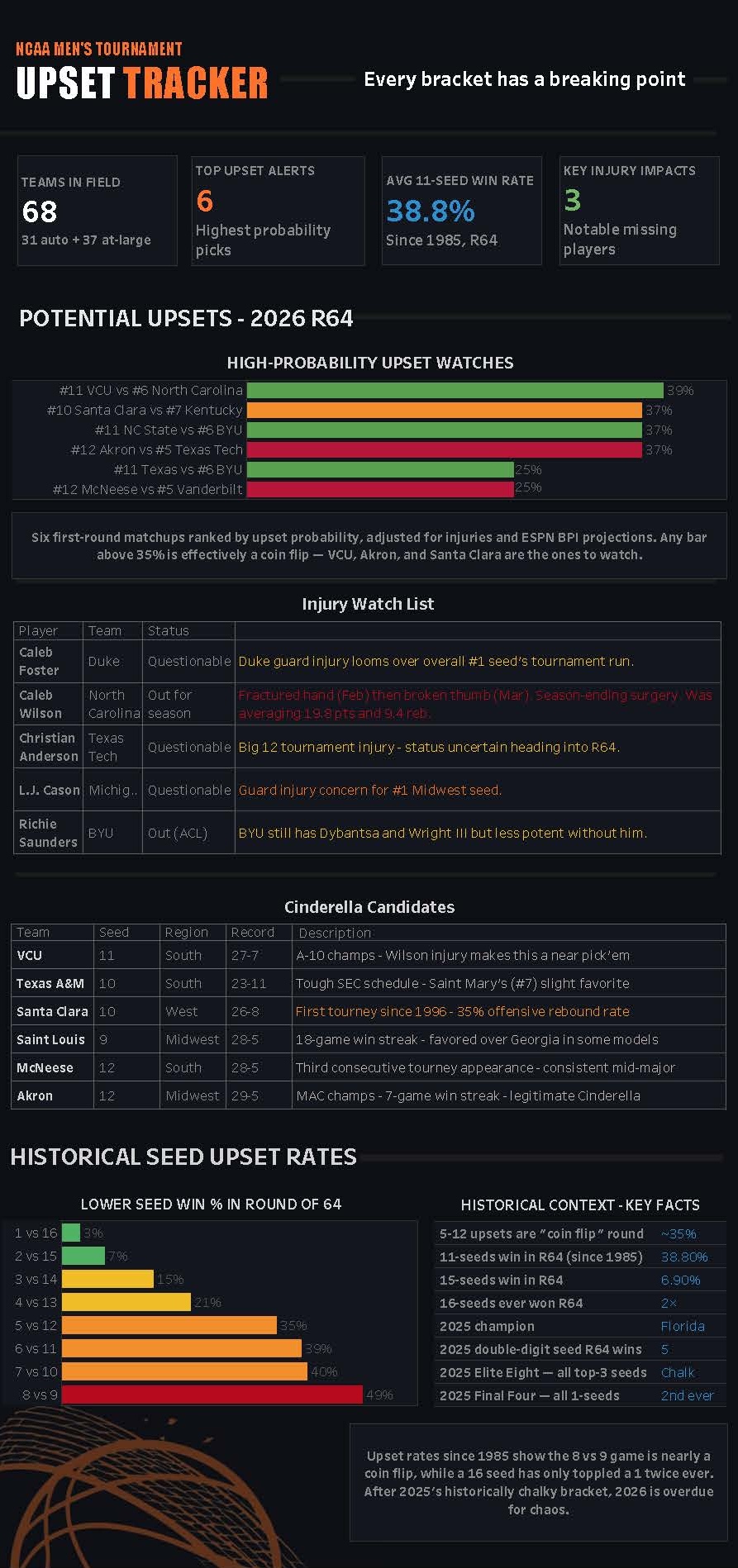 “March Madness generates more bracket activity than almost any other sporting event in the country, yet most people still make their picks based on gut feel rather than data,” Michelle explains. “I wanted to create a dashboard that gives viewers a clear, visual way to understand where upsets are most likely to happen—and why.”