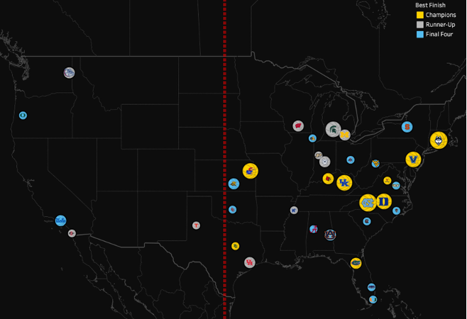 "I wanted to visualize not just those that made the Final Four, but where those programs are geographically, how many times they've been there, and what their best finish was within the constraints of our sample data,” Sean says. “When you put it on a map, patterns you'd never notice in a standard table become clear."