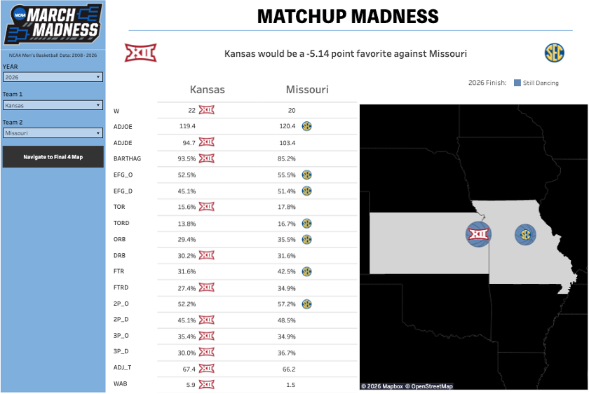 These dashboards highlight what Business Intelligence uncovers at its core: we do not aim to eliminate uncertainty; instead, we equip you to navigate it more intelligently. Whether you are analyzing a Kansas vs. Missouri spread, mapping two decades of Final Four geography, exploring where upsets are most likely, or running a field of 68 teams through a set of championship filters, the data tells a story that pure intuition cannot.